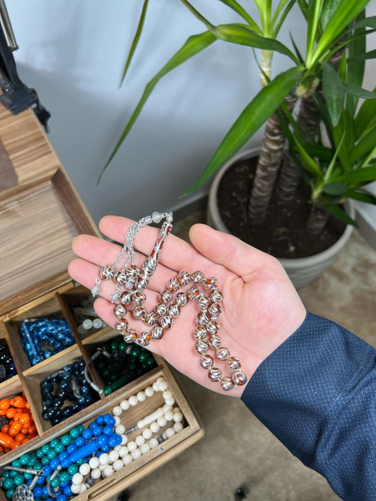 يتميز المسباح بلمعانه الفضي الجذاب ولمساته الفاخرة، مع نقوش هندسية تعزز من جماليته، كما أنه مزود بـ طربزونة فضة أنيقة تمنحك إحساسًا بالفخامة في كل استخدام.